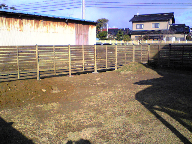施工日:H19.11.13 施工を決めた理由:以前のフェンスは10年で老朽化してしまい、非常に危ない状態でした(施工前)、このフェンスは柱が鉄骨で強度が強く防腐も他にない強力なものでしたので、木好きな私にはちょうど良いものでした。